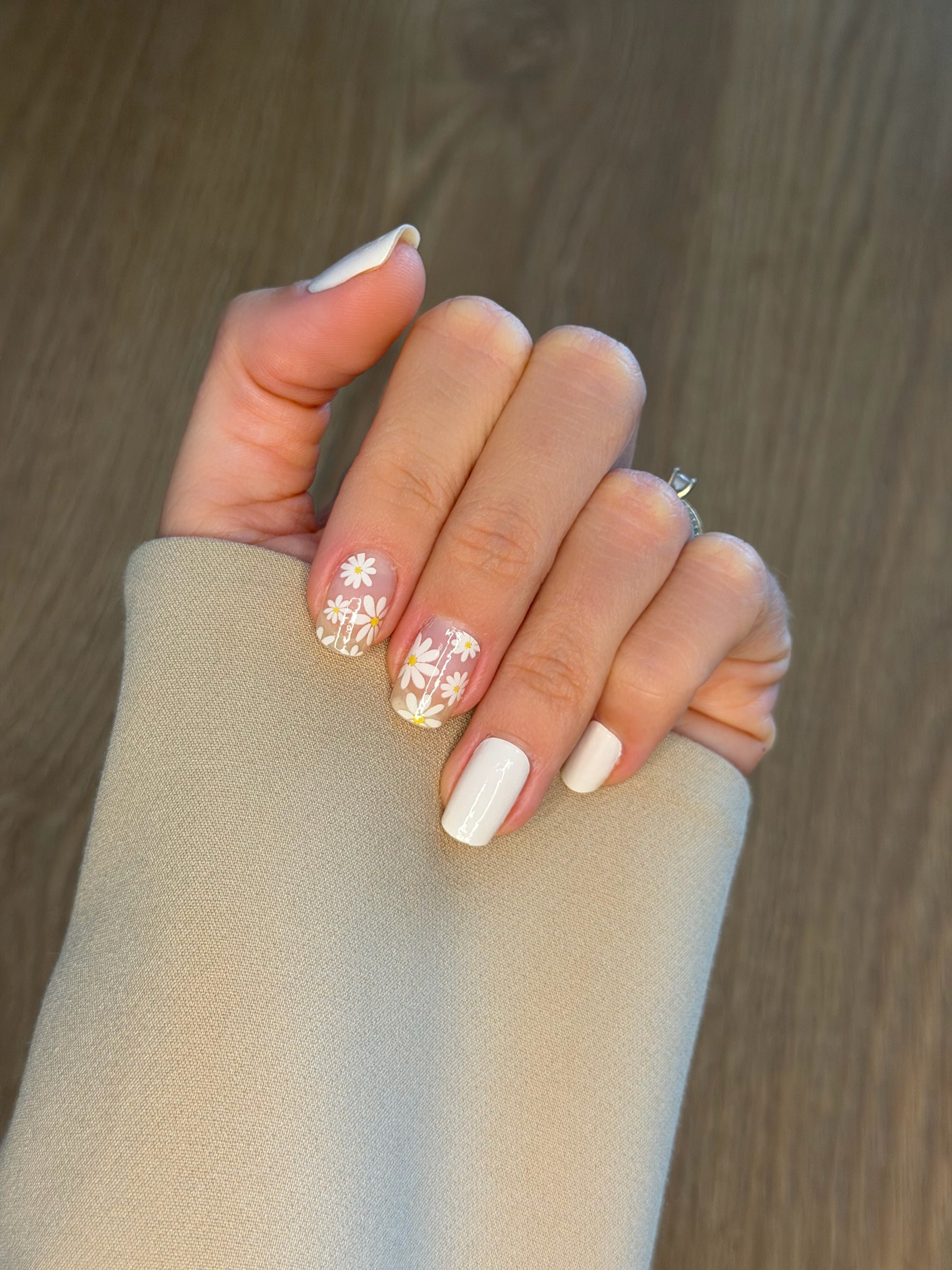 The clean nude base keeps it minimal, while the subtle flower accents add just the right touch of charm. It’s perfect for everyday wear, brunch dates, or whenever you want something light, fresh, and polished without being overdone.